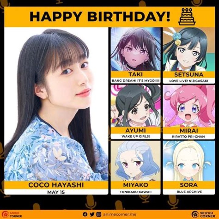 Coco Hayashi (林 鼓子 , Hayashi Koko, born 15 May 2002) is a Japanese actress and voice actress associated with 81 Produce and Avex Pictures. She is best known for voicing Ayumi Hayashi in Wake Up, Girls! New Chapter! and Mirai Momoyama in Kiratto Pri Chan.